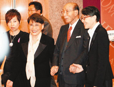 中新網(wǎng)9月29日電 據(jù)香港“文匯報(bào)”消息,“2010年度邵逸夫獎(jiǎng)?lì)C獎(jiǎng)禮”昨晚在香港舉行,頒獎(jiǎng)禮開(kāi)始前,六叔邵逸夫在女秘書(shū)攙扶下與特首曾蔭權(quán)及五位得獎(jiǎng)?wù)叩讲季鞍迩懊,讓媒體拍照,當(dāng)六叔準(zhǔn)備入場(chǎng)時(shí),突然現(xiàn)身的六嬸方逸華則在旁邊拖著他進(jìn)場(chǎng),期間有媒體大聲問(wèn)到有關(guān)無(wú)線轉(zhuǎn)售股份一事,不過(guò)六叔未有回應(yīng)