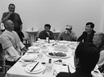 當(dāng)晚記者趕到片場(chǎng)時(shí),正好是各位大腕們中場(chǎng)休息就餐。也正趕上趙本山的朋友給他送來(lái)了一桌子菜,趙本山和老搭檔范偉、導(dǎo)演黃建新等人一起吃了起來(lái),發(fā)哥也在工作人員的帶領(lǐng)下,到這桌來(lái)湊個(gè)熱鬧,和趙本山對(duì)桌而談。