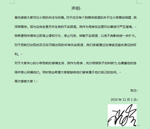 中新網(wǎng)11月2日電 近日,有消息稱大S未婚夫汪小菲曾離婚,并有一女,對此,汪小菲母親、俏江南董事長張?zhí)m女士對其子汪小菲已婚離異的不實報道發(fā)出聲明。內(nèi)容如下: