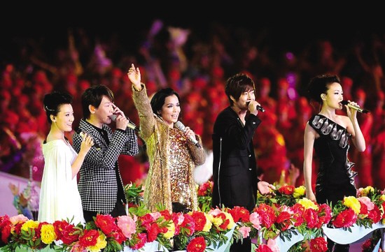 此次亮相開幕式,韋唯和譚晶、陶喆、金賢重、容祖兒等五人共同演唱《日出東方》。已是前輩的韋唯梳著時髦的發(fā)型,毫不顯老。