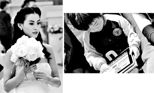 當(dāng)天拍攝的是《最強(qiáng)囍事》中的重頭戲:搶親。杜汶澤好不容易將張柏芝追到手,哪知就在婚禮即將舉行的一刻,對(duì)張柏芝情深意切的古天樂突然出現(xiàn)在現(xiàn)場(chǎng),不由分說(shuō)就要將張柏芝搶走。一見身披婚紗的張柏芝,就不由令人想起她和謝霆鋒的幸;橐錾。提起謝霆鋒,張柏芝立刻就笑了,甜蜜表示:“霆鋒來(lái)探班過,但因?yàn)橛袘蛟谏,才呆?5分鐘就走了。”雖然只有15分鐘,但對(duì)于張柏芝來(lái)說(shuō),已經(jīng)很是滿足。張柏芝坦言,那么多年沒有拍戲,剛剛站到鏡頭前的一刻,確實(shí)有些不習(xí)慣和緊張,還好有老公在身邊支持自己:“他是很靦腆的人,在片場(chǎng)話雖然不多,已經(jīng)是很關(guān)心的舉動(dòng)了,我很開心!