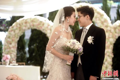 一對新人于正午12時舉行儀式,當結(jié)婚進行曲響起時,花童們首先進場,接著是16位兄弟姐妹逐一步入會場,戴著白色頭紗的郭晶晶則面帶含蓄笑容,在父親的帶領(lǐng)下進場,現(xiàn)場賓客均以掌聲歡迎。