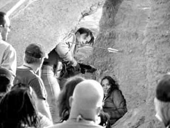 昨日(18日)拍攝的這場(chǎng)戲講的是布蘭登·弗雷澤與瑪麗亞·貝羅遭到敵人的追殺,二人在沙漠中一邊躲避弓箭的襲擊,一邊還擊,雕翎箭與短槍的交火頗有些“關(guān)公戰(zhàn)秦瓊”的味道。布蘭登扮演的里克一身牛仔裝扮,手拿一把短槍?zhuān)琅f延續(xù)了前兩集中的扮相,而瑪麗亞扮演的艾芙琳則穿著深棕色短款?yuàn)A克,足蹬馬靴,手持一把手槍。導(dǎo)演羅伯·科恩一聲“開(kāi)始”后,他們?cè)趲r石后緊張地躲避著敵人的追趕,此時(shí),一支雕翎箭射來(lái),擦著布蘭登的右臂射進(jìn)土墻,布蘭登立即伏地掩護(hù)瑪麗亞,并迅速用槍還擊,而瑪麗亞也起身與他并肩作戰(zhàn)。盡管這個(gè)鏡頭在片中只出現(xiàn)短短的10秒鐘,但科恩導(dǎo)演還是讓兩位主演拍了3遍。