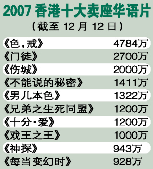 臨近年底,電影界又到了總結(jié)之時。前日,香港影業(yè)協(xié)會公布了今年香港電影的票房情況:因為經(jīng)濟回升,香港電影也隨之升溫,全年票房有望超過10億港元,而僅《色,戒》一片就以近5000萬的票房,撐起了華語片的半邊天。