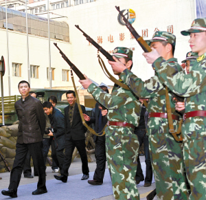 繼在北京舉行了盛大的首映禮之后,《集結(jié)號》主創(chuàng)一行十多人又馬不停蹄地來到上海展開宣傳活動。19日下午,新聞發(fā)布會選擇在上海電影集團(tuán)5號攝影棚進(jìn)行。在馮小剛帶領(lǐng)“谷子地”張涵予、廖凡、王寶強(qiáng)、任泉、袁文康、李乃文等主創(chuàng)入場時,武警戰(zhàn)士還鳴槍歡迎。整個發(fā)布會現(xiàn)場也布置成了片中硝煙彌漫的“戰(zhàn)場”,有沙袋、機(jī)槍、戰(zhàn)壕等。發(fā)布會后男主創(chuàng)們還乘敞篷吉普車和軍用卡車前往首映的電影院。