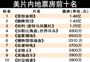 美國(guó)大片的票房收益在中國(guó)內(nèi)地市場(chǎng)2007年繼續(xù)增長(zhǎng),20部分賬大片總票房收益合計(jì)達(dá)到11.7億人民幣!蹲冃谓饎偂芬2.77億元占頭把交椅,《蜘蛛俠3》居第二。而包括《美食總動(dòng)員》在內(nèi)在世界其他市場(chǎng)上取得好成績(jī)的動(dòng)畫(huà)片,中國(guó)票房則不佳。