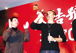 來(lái)給馮小剛捧場(chǎng)的除了劇組要答謝的各方人士,自然也少不了圈內(nèi)的藝人。葛優(yōu),李冰冰、張靚穎,還有當(dāng)天下午剛剛簽約華誼的安以軒都出現(xiàn)在慶功宴現(xiàn)場(chǎng),但最引人注目的還是“東北來(lái)賓”趙本山。從電影《集結(jié)號(hào)》的籌備拍攝,到影片獲得票房口碑的雙豐收,勞苦功高的導(dǎo)演馮小剛在慶功會(huì)上顯得尤為激動(dòng),頻頻舉杯感謝前來(lái)出席發(fā)布會(huì)的媒體記者、影片幕后工作人員、在座主創(chuàng)以及前來(lái)慶賀的圈中好友。作為《集結(jié)號(hào)》的靈魂人物,馮小剛導(dǎo)演少不了要上臺(tái)說(shuō)點(diǎn)什么,也許是之前已經(jīng)幾杯小酒下肚,馮導(dǎo)上來(lái)一句客套話也沒(méi)招呼,直接掏心窩子,“我是一個(gè)很性情的人,遇到了一個(gè)很性情的編劇劉恒,寫(xiě)了一個(gè)很性情的劇本,我們就拍了一部很性情的電影,起用了這么一批很性情的兄弟,獲得了這么一個(gè)很性情的票房,也讓全國(guó)的電影觀眾很‘性情’!币环捳f(shuō)完,小剛又邀全場(chǎng)共同舉杯,自己先一飲而盡。