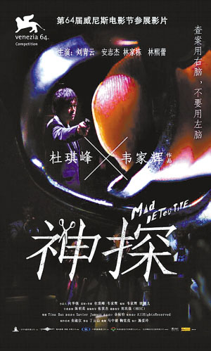 《神探》由杜琪峰和韋家輝共同導(dǎo)演,劉青云、安志杰、林熙蕾主演。2007年該片曾在最后一刻入圍參加威尼斯電影節(jié),被稱為“驚喜電影”。其后,該片于2007年11月在香港上映,在今年1月公布的第27屆香港電影金像獎上也獲得8項提名。劉青云在片中扮演一位擁有特異能力的退職警察,受安志杰邀請重新出山破案。而在片中扮演劉青云太太的是林熙蕾,在片中她飾演兩個角色,一方面是劉青云太太,另一方面是劉青云幻想出來的人物。