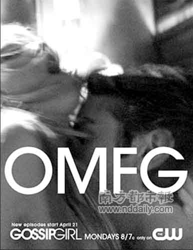 《緋聞女孩》是今年CW電視臺(tái)的新劇,由曾經(jīng)紅極一時(shí)的《橘子郡男孩》(TheO.C.)制作人打造,盡管收視率同樣不高,但是在全美掀起了新的時(shí)尚潮流。作為偶像劇,劇情并沒(méi)有特別的新意,但是該劇制作非常精良,從音樂(lè)到服飾,全部走在時(shí)尚最前沿,再加上光鮮亮麗的主演,在劇中盡情的談情說(shuō)愛(ài),十分養(yǎng)眼,在美國(guó)成為高中生追捧的話題劇集。經(jīng)過(guò)編劇罷工風(fēng)波,《GossipGirl》最近重返美國(guó)小屏幕,為了打響聲勢(shì),CW電視網(wǎng)制作兩款海報(bào),引起不少爭(zhēng)議,其中一款以主角C和B的激吻為畫(huà)面,另一款主打S和N上床的激情戲,并打上“OMFG”的大字。