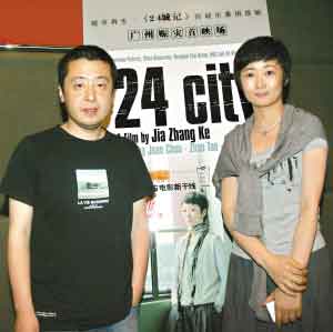 賈樟柯和趙濤站在《二十四城記》海報(bào)前。