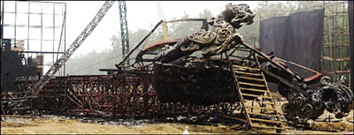 昨天中午,記者趕到現(xiàn)場時,劇組工作人員在事發(fā)地數(shù)百米周圍都拉起白線,禁止人員隨意進入現(xiàn)場。被燒仿古戰(zhàn)船停在科技園東北角處,停放在劇組場地中間位置平地上,長約20米,整個船身被燒得只剩一個骨架,另一艘小戰(zhàn)船船頭也發(fā)生破損,場地四周一面帷幕墻被燒毀。