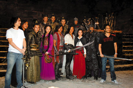 走進(jìn)攝影棚,首先看到兩邊搭起了一座插滿劍的高臺。臺階下,飾演絕無神的任達(dá)華和幾名飾演武林俠士的群眾演員正在拍一場打戲。這場戲說的是,絕無神把步驚云和聶風(fēng)等人捉住了,武林俠士們決定合力和絕無神決一死戰(zhàn),以求救出步、聶兩人。一個(gè)鏡頭拍了好幾次,完成后,身穿鎧甲的任達(dá)華已經(jīng)大汗淋漓,他痛苦地?cái)D著臉部肌肉,指著勒緊了脖子的戲服說:“無法呼吸了,(這衣服)只有三個(gè)口出氣!比芜_(dá)華在戲里只有這一套重25公斤的皮制衣服,在泰國拍了12天,每天都要穿著它12個(gè)小時(shí)。