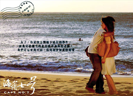 最近,臺灣很流行一句話:“你,海角了嗎?”源于一部賣座臺灣本土電影《海角七號》。目前,這部電影的票房已經(jīng)超過3.2億元新臺幣(約8000萬元人民幣),刷新了臺灣有正式票房統(tǒng)計(jì)以來華語電影票房的最高紀(jì)錄,不僅超過了《色,戒》,還一舉將16年前成龍主演的《超級警察》踢下冠軍寶座。據(jù)說,有影迷竟連看18遍,片中“永不放棄”的小人物成為了大家的“心靈雞湯”。難怪導(dǎo)演魏德勝發(fā)話:“別小看臺灣電影!”