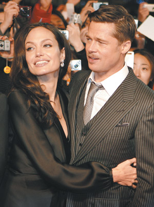 皮特與茱莉約在東京時間傍晚6點10分抵達六本木戲院,兩人一路恩恩愛愛,“星光大道”也成了兩人“愛的大道”。
