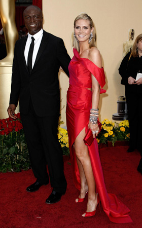 美國(guó)西部時(shí)間2月22日下午17:00(北京時(shí)間2月23日上午9:00),第81屆奧斯卡金像獎(jiǎng)?lì)C獎(jiǎng)典禮在洛杉磯柯達(dá)劇院舉行。圖為名模海蒂·克拉姆(Heidi Klum)與老公Seal攜手亮相奧斯卡紅毯。一身紅色禮服的海蒂更顯高貴典雅。