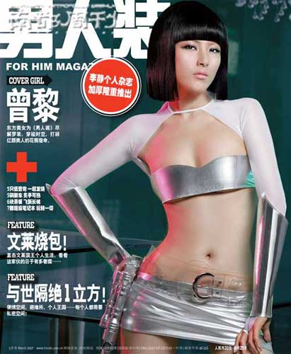 看著這個美人從古典端莊飛躍到裸露性感,從此,我們都知道應(yīng)該脫了,就是不知道怎么才能既脫成那樣,又保護(hù)了自己。把自己扒光了給人看也是需要勇氣的,盡管曾黎說是《男人裝》PS掉了她穿的內(nèi)褲,可不能否認(rèn),這一脫將她的端莊形象一掃而空。感謝《男人裝》,在電影分級制度看不到曙光的前提下,率先用雜志演繹出了性感靜像電影,唯一的遺憾是,如果雜志做成3D立體效果就好了。