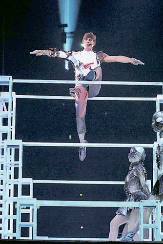 郭富城在高低杠上演出大玩危險(xiǎn)動(dòng)作。