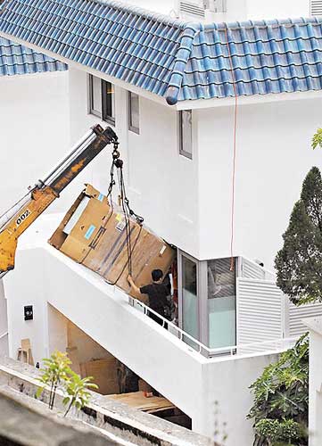 請來起重機(jī)將冰箱吊入新居。