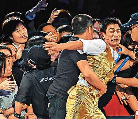 中新網(wǎng)12月25日電 劉德華前晚在紅館演出第三場演唱會,繼續(xù)以好歌會知音,但出現(xiàn)輕微聲沙情況,他見臺下歌迷都熱情狂叫,擔(dān)心大家會一齊失聲。有歌迷親近偶像心切,差點把華仔拉下臺,幸好保安人員上前解圍。