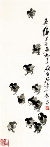 一代宗師喜不自勝,老懷大慰。故此每每含笑捋須,捉筆揮灑,欣欣然在自己得意門生的畫幅上頻添妙筆,并作題記:“秀儀弟子畫貓之墨色為白石所添”;“秀儀女弟子畫小雞七只,老人多事,再添五只!痹圃啤