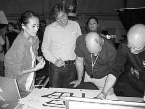章子怡(左)向各國(guó)影人介紹四川地震災(zāi)區(qū)的情況