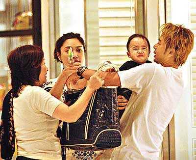 中新網(wǎng)6月17日電 香港男歌手李克勤與愛妻盧淑儀的愛情結(jié)晶立仁已經(jīng)八個(gè)月大,昨日李家三代同行到商場(chǎng)逛街,兒子突然吵鬧不停,克勤緊張得立刻從太太手中搶過孩子來抱,做媽媽的盧淑儀還當(dāng)街扮鬼臉引兒子笑。