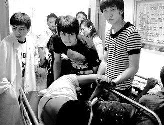 “痛死了!痛死了!”昨天下午,記者在長征醫(yī)院骨科急診室,見到了在移動病床上呻吟的陳澤宇,他側(cè)臥在床上,蜷著身子,嘴唇干裂發(fā)白。病床周圍簇?fù)碇靶值苈?lián)”的毛方圓、巫迪文、鐘凱和他們的經(jīng)紀(jì)人,“好男兒”緊緊抓著陳澤宇的雙手(見圖孫中欽攝),經(jīng)紀(jì)人則買來礦泉水和吸管,喂他喝水。