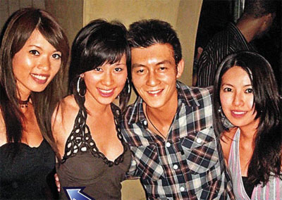 喝到面紅耳赤的陳冠希被夾在一群辣妹中間。