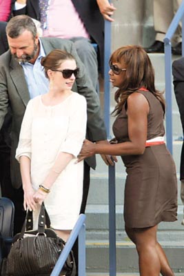 接連出席完威尼斯與多倫多電影節(jié)的安妮·海瑟薇(左)又馬不停蹄地出現(xiàn)在美網(wǎng)決賽場邊。