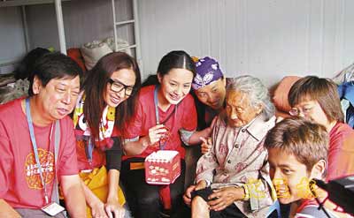 據(jù)香港文匯報報道,鐘欣桐、鄭希怡和李逸朗前日以英皇慈善基金成員身份,出席在四川擂鼓鎮(zhèn)舉行的“英皇擂鼓心連心關愛賀中秋”探訪活動。身著紅色T恤、牛仔褲和靴子的阿嬌,看起來很精神。他們一行三人先到一位婆婆的家探訪,和婆婆傾偈之余又為她按摩,原來婆婆的十名親人在早前的大地震死去,只剩下一個孫女,他們離開婆婆的家時,對方又送他們花生,當被拒絕時,婆婆實時落淚,阿嬌和鄭希怡就借機引開婆婆的注意力,讓李逸朗把花生放回婆婆家中。