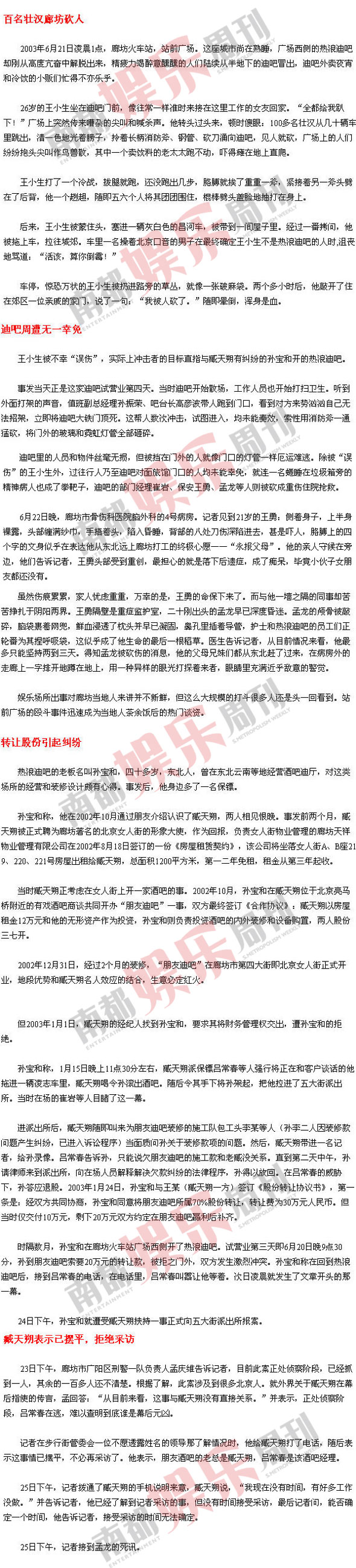 2003年的我正供職于京城某家在市場(chǎng)上享有盛譽(yù)的報(bào)社。那年夏天,孫寶和找到報(bào)社,拿了一大堆文字資料和現(xiàn)場(chǎng)照片,聲稱自己遭黑社會(huì)迫害,幕后主謀就是歌星臧天朔。當(dāng)時(shí)報(bào)社在異地采訪問題上一直相當(dāng)慎重,但沒想到很快就得到領(lǐng)導(dǎo)的充分許可。我和另一名攝影記者連夜趕往廊坊進(jìn)行了一周多的調(diào)查。令我深感意外的是,這么大動(dòng)靜的毆斗居然沒有第二家媒體介入,更談不上披露問題,相關(guān)的細(xì)節(jié)和猜想也僅在群眾中間悄然流傳,我們成了惟一到現(xiàn)場(chǎng)采訪的記者。