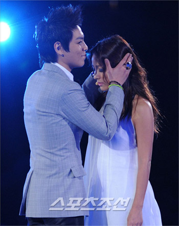 據(jù)體育朝鮮報道,15日晚7時,在首爾蠶室室內(nèi)體育館舉行的“2008 Mnet-KM音樂節(jié)”( 以下簡稱“MKMF”)上,李孝利和T.O.P在共同演繹《謊言》時,表演了兩個嘴唇互碰的熱吻場面。