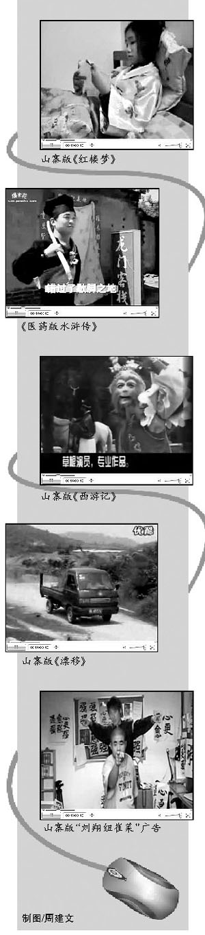 這只是近期眾多走紅網(wǎng)絡(luò)的網(wǎng)友自制影視劇中的一部。在電腦中輸入“山寨”一詞就會(huì)發(fā)現(xiàn),電視劇《水滸傳》、《西游記》,電影《大話西游》、《尋槍》、《頭文字D》,“優(yōu)樂(lè)美奶茶”、“劉翔紐崔萊”以及部分電視購(gòu)物廣告,均被推出了山寨版。