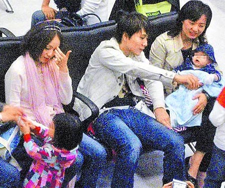王仁甫(中)機(jī)場逗著哭鬧的兒子YaYa(右前),季芹(左)與女兒樂樂(左前)則陪在一旁。