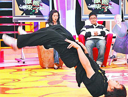 釋小龍(前)昨錄《康熙來(lái)了》表演在地板上翻身躍起的動(dòng)作。