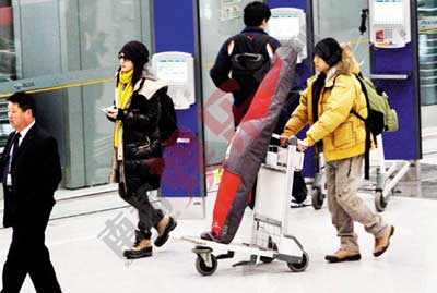 兩人情侶打扮,還帶著裝滑雪板的長袋子,裝備專業(yè)?磥恚矚g北海道的不僅僅是梁朝偉和劉嘉玲。