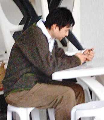 玩了近半小時后,倪震聞得餐廳出名奶類食品,登時大感興趣,連忙與友人行到售賣處挑選,但他們沒有理會排隊的人龍,似有插隊之嫌。二人選了馳名的姜汁撞奶,還有燒賣與餐蛋面等,胃口似乎十分不錯,他更自行走開尋找位置坐下,然后即迫不及待不停地發(fā)出短信,臉上還流露笑容。