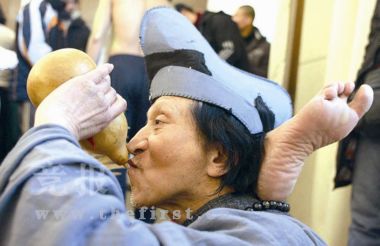 在演員較為集中的一個(gè)大會議室中,一個(gè)赤膊的青年男子在往身上涂金黃色的顏料,化妝師在給姑娘們卷頭發(fā)。角落的地面上,“濟(jì)公”旁若無人,一手拿著扇子,一手拿著葫蘆,腳后跟枕在腦后,似乎在練“柔術(shù)”。