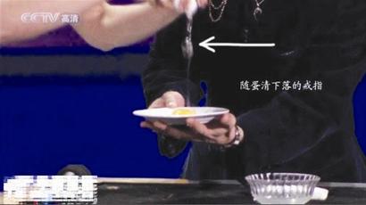 圖七,好了,這一動(dòng)作做完后,劉謙用左手接過董卿的戒指把玩一番,并問董卿這枚戒指有多貴,這一過程,劉謙很自然地把戒指放到了右手,注意,是塞到了右手的食指和拇指中間,因?yàn)橛沂值氖持负湍粗钢虚g已經(jīng)捏著個(gè)被皮筋拉扯的掛鉤,塞進(jìn)戒指后他用左手扭動(dòng)著戒指,好像在做下意識(shí)的動(dòng)作,其實(shí),是把戒指環(huán)掛到那個(gè)掛鉤上,這一動(dòng)作是在右手的食指和拇指“捏合”之中完成的,觀眾是看不到的,由于角度的原因,觀眾也看不到那根細(xì)細(xì)的皮筋。