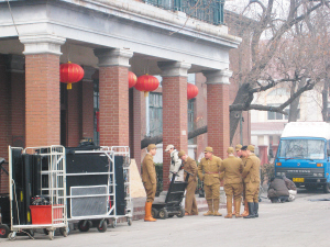 除了道具和布景以外,另一邊演員和造型師也忙得不可開交,記者在現(xiàn)場看到,造型師正一遍又一遍地檢查著各位演員的服飾和妝容,并且還要對每一雙鞋進(jìn)行做舊處理,以達(dá)到最佳拍攝效果。當(dāng)看到幾位群眾演員的軍裝領(lǐng)口,露出不符合時代背景的內(nèi)衣后,就立刻要求他們脫下。記者看到,就連每一位群演的化妝也都細(xì)致入微,有的因為要調(diào)整膚色將粉底涂至脖子根部,有的被化妝師在臉上做出了好似疤痕的效果,更有甚者,因為發(fā)型不符合電影故事發(fā)生年代,竟被發(fā)型師當(dāng)場剃成“板寸”。記者在現(xiàn)場還看到幾位候場的日本演員,敬業(yè)的他們在開拍前很久便開始對著鏡子反復(fù)練習(xí)。