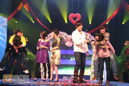 完美的“新娘抱”過后,粉絲的熱情只增無減,演播廳的大屏幕又很是適宜的播放鄭元暢、林依晨主演的偶像劇《我的愛情面包》中,鄭元暢橫抱林依晨參加耐力比拼游戲的片段。主持人張丹丹提議現(xiàn)場(chǎng)派出四名粉絲(兩男、兩女)上臺(tái)來玩“耐力大比拼”的游戲。搞怪的鄭元暢更是提議游戲中,由女生背男生進(jìn)行游戲,增加比賽難度。