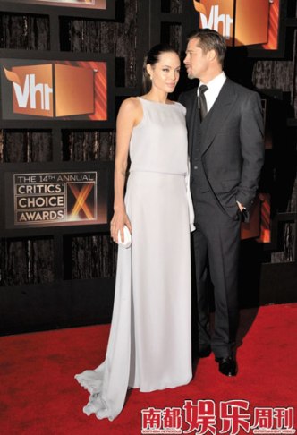 自從兩人生孩子后,感情有增無減,朱莉的這身白色曳地長裙如希臘女神般優(yōu)雅,彼特只要站著當(dāng)當(dāng)甘草,兩人就是最般配的一對。
