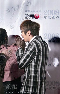 昨晚,首先走上紅毯的就是JJ林俊杰,他先是“護(hù)送”著阿Sa和容祖兒出場,待兩人和主持人“接頭”之后,又趕回了紅毯的始發(fā)地,迎接自己公司力捧的兩位小師妹BY2。不過忙中出亂,想在簽名板上簽下“海蝶家族”的他一時間寫成了“海蝶家且”,發(fā)現(xiàn)不妙后立即把且劃掉了,寫下了族,搞得臺下的影迷們緊張了半天。