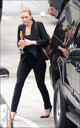 凱特·溫絲萊特對于自己的奧斯卡影后的稱號(hào)也是相當(dāng)激動(dòng),下面小編給大家?guī)硪唤M圖片,大家可以看到,影后拿著小金人一直不肯撒手,生怕碰壞,可以看得出她是多么重視這個(gè)獎(jiǎng)項(xiàng)了吧。順便說一下影后的穿著,一身黑色職業(yè)性濃厚,干練的盤發(fā)透出影后的氣勢。
