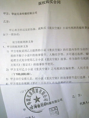 “這個合同現(xiàn)在都還在,我們能證明當(dāng)初他們是對這本書有改編興趣的,如今《非誠勿擾》中的諸多雷同不是巧合!弊蛉赵蓭熃o記者送來了合同復(fù)印件。合同中,華誼兄弟提出:“可通過選擇、編輯等任意處理方式充分使用《重慶空姐》故事,作為制作電視劇《愛在三萬英尺》的故事情節(jié)使用,華誼兄弟方面將支付版權(quán)費10萬元!痹蓭煴硎,希望法庭能夠還作者一個公道,尊重作者的合法權(quán)益。