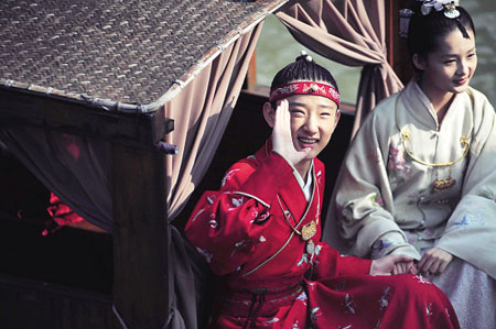 在這個(gè)問題上,造型設(shè)計(jì)葉錦添可算是有先見之明,據(jù)說給小寶玉設(shè)計(jì)的戲服,里面的縫正好夠他長(zhǎng)個(gè)兒。但是即便如此,于小彤還是露著腳踝!