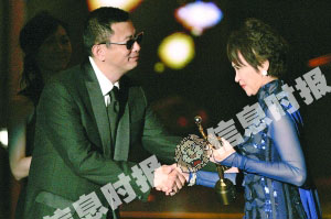湯唯自從成為香港人之后久未露面,前日,一身火紅晚裝的她從紅地毯到頒發(fā)新晉導(dǎo)演和最佳新演員獎,甚至回答內(nèi)地媒體的普通話提問時,湯唯都始終講粵語。而在紅地毯上,主持人錢嘉樂笑言聽說湯唯最近粵語精進,于是給了她一個秀粵語的機會跟現(xiàn)場觀眾打招呼。湯唯與劉美君在頒獎時,有段大談新人經(jīng)歷的對話,劉美君說:“現(xiàn)在好多新人都是泥,還要是爛泥扶不上壁,真是好慘!辈贿^TVB在轉(zhuǎn)播時刪去了這段對話。