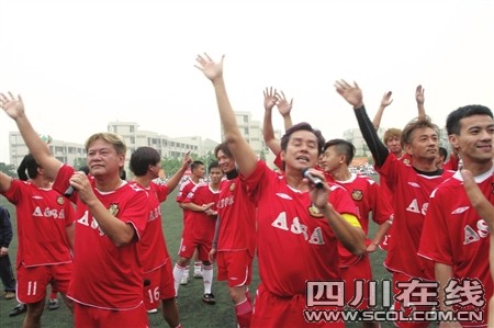 下午5時(shí),義賽結(jié)束,現(xiàn)場(chǎng)出現(xiàn)感人一幕:災(zāi)區(qū)的11個(gè)學(xué)生,舉著寫(xiě)有“災(zāi)區(qū)學(xué)子謝謝您!感恩奮進(jìn)!”的大牌子來(lái)到球場(chǎng)中間,以示謝意。在地震當(dāng)天出生的10個(gè)孩子,與明星們結(jié)上幫助對(duì)子。