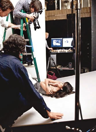 雖然Sorrenti的要求難度極高,甚至要章子怡躺在地板上,她非常專業(yè)完全沒有推托,讓站在梯上的Sorrenti以俯身姿態(tài),俯拍其長(zhǎng)發(fā)飄逸的大頭照片。