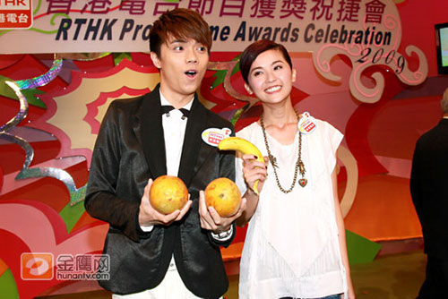 蔡卓妍(阿Sa)、張敬軒6日為港臺獲獎祝捷會擔(dān)任頒獎嘉賓,會上公布0八至0九年度獲得的七十七個國際及本地電視獎項。活動后,阿Sa與軒仔影合照,軒仔拿著兩個大木瓜遞給阿Sa,并笑說:“以形補形!